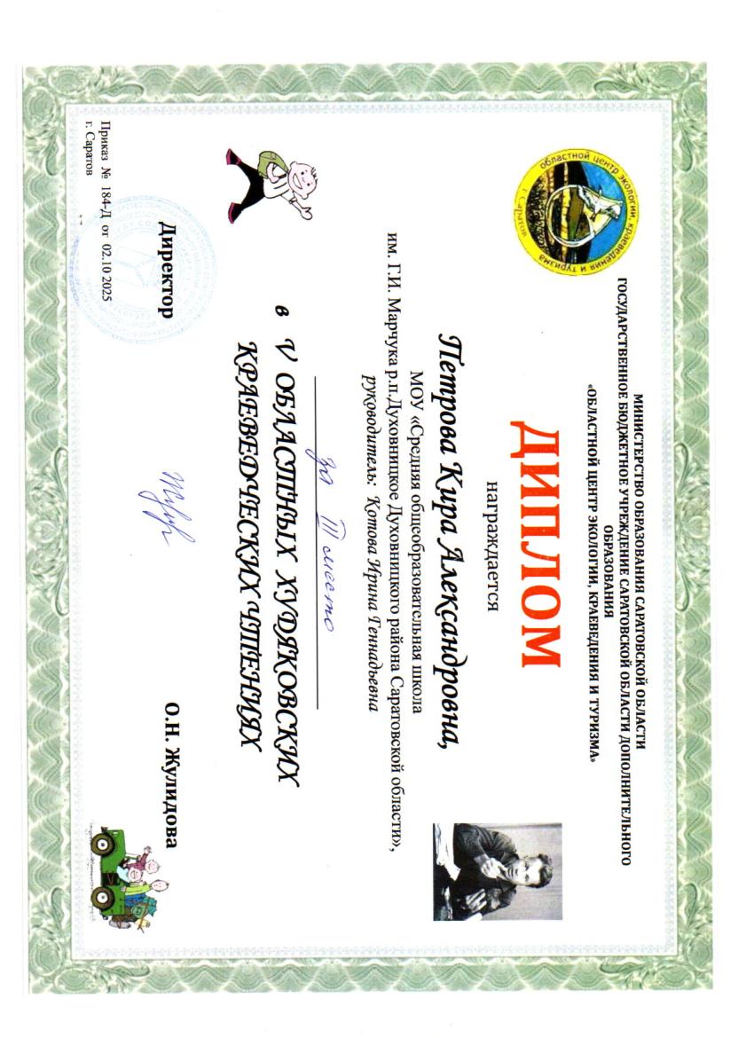 Кира представила свою исследовательскую работу в номинации «Не за тридевять земель». Работа Киры была отмечена жюри, в состав которого вошли представители ученого и музейного сообщества, а также регионального центра допризывной подготовки молодежи, Дипломом III степени.